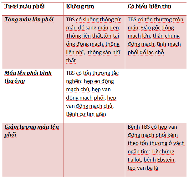 Hiện nay có rất nhiều cách phân loại bệnh tim bẩm sinh khác nhau, tuy nhiên cách phân loại dựa trên dấu hiệu lâm sàng tím và mức độ tưới máu phổi (tăng, bình thường hay giảm: Thấy rõ trên phim chụp XQuang tim phổi) vẫn được coi là phương pháp phân loại thông dụng nhất và được áp dụng rộng rãi.