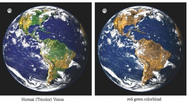 Trái Đất bình thường (bên trái) và Trái Đất trong mắt người bị mù màu đỏ - xanh lá (bên phải)