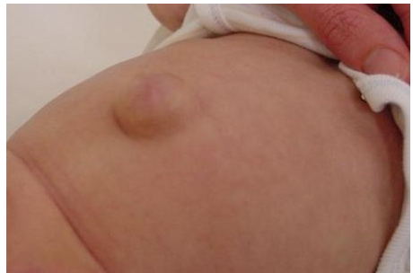 Bạn thấy một khối cứng, thuôn dài bằng ngón tay cái ở vùng bẹn hoặc bìu của trẻ. Cục này có thể bị lồi ra ngoài khi trẻ vận động hay khóc và thụt lại vào trong ổ bụng khi trẻ nghỉ ngơi.