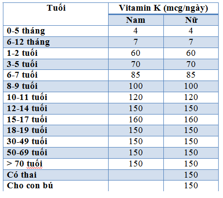 Với mỗi độ tuổi, nhu cầu vitamin K, đặc biệt là vitamin K2 sẽ khác nhau, tùy thuộc vào tuổi, giới và một số yếu tố khác như tình trạng mang thai, cho con bú, hoặc mắc bệnh. Dưới đây là khuyến cáo mới nhất của Viện Dinh dưỡng quốc gia năm 2016 dành cho người Việt Nam:
