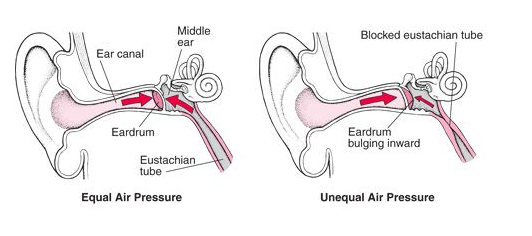Khi độ cao thay đổi đột ngột, áp suất không khí được cân bằng ở hai mặt màng nhĩ ở vòi nhĩ có chức năng bình thường. Vòi nhĩ khỏe mạnh mở thường xuyên và đủ rộng để cân bằng sự thay đổi áp suất không khí. Khi thay đổi độ cao, chẳng hạn khi máy bay hạ cánh, áp suất không khí càng tăng khi máy bay càng hạ, sự thay đổi này đẩy màng nhĩ vào trong. Những người bị tắc vòi nhĩ có thể càng bị đầy tai, khả năng nghe kém và thậm chí đau khi điều này xảy ra. Những người có chức năng vòi nhĩ kém có thể trải nghiệm triệu chứng tương tự khi đi thang máy, lái xe qua núi hoặc lặn xuống đáy bể bơi. Thợ lặn chuyên nghiệp sẽ học các thủ thuật để cân bằng áp suất trong tai.